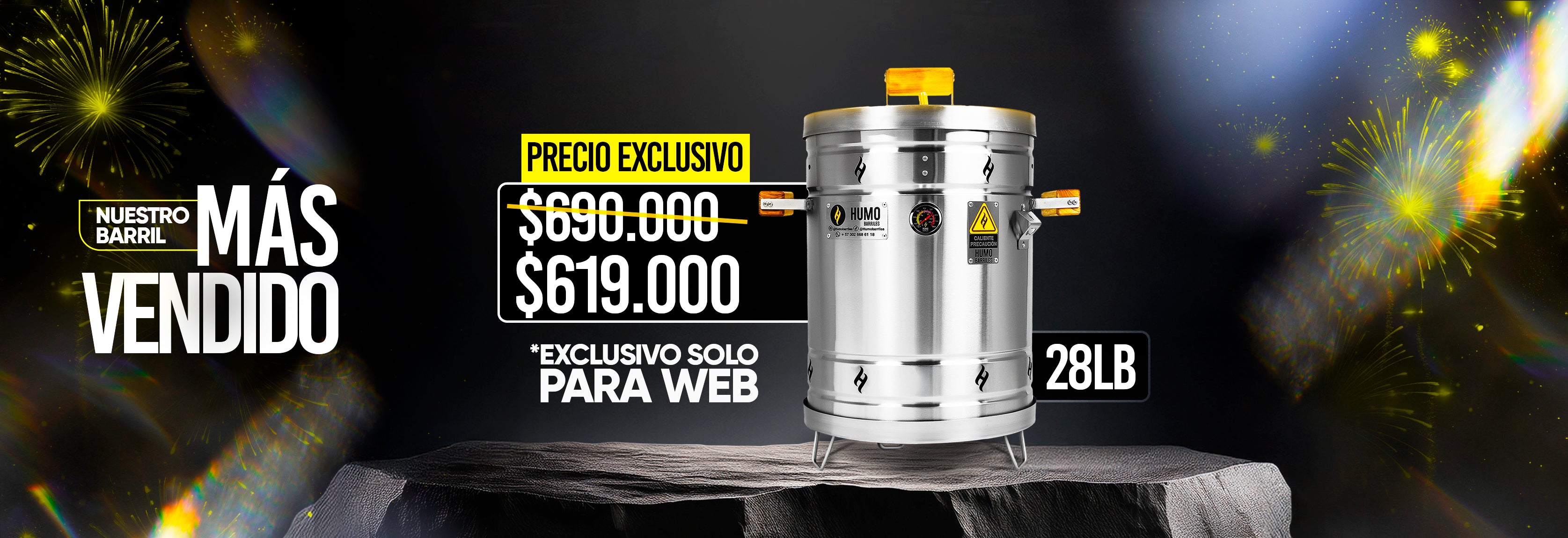 El Barril Grande de 38 libras es perfecto para esos asados épicos. El barril más chimba para parceros que disfrutan de grandes asados al barril, ofreciendo carne jugosa y un ahumado bien chimba.